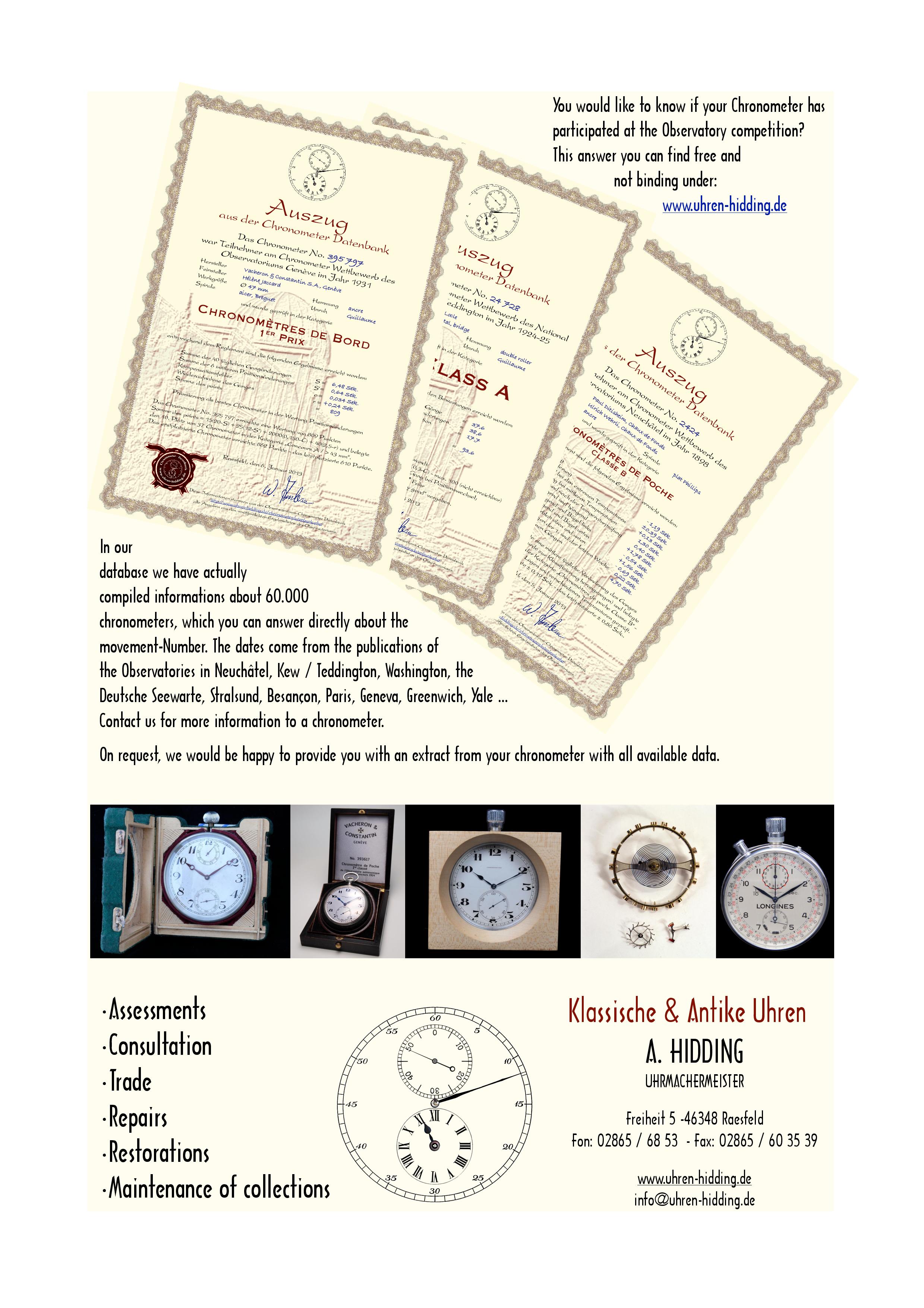 On request we would be happy to provide an abstract of your chronometer watch with all data available for a service charge of 50,00 €.